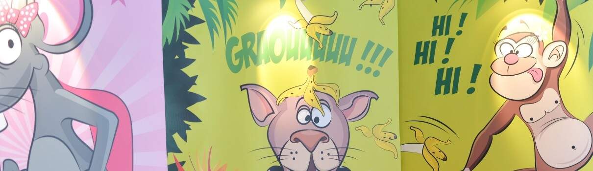 Nous vous proposons différentes ambiances : « Jungle », « Baloon » et « City ». Le décor cartoon s’adapte à toute surface et aux enfants de 2 à 77 ans !